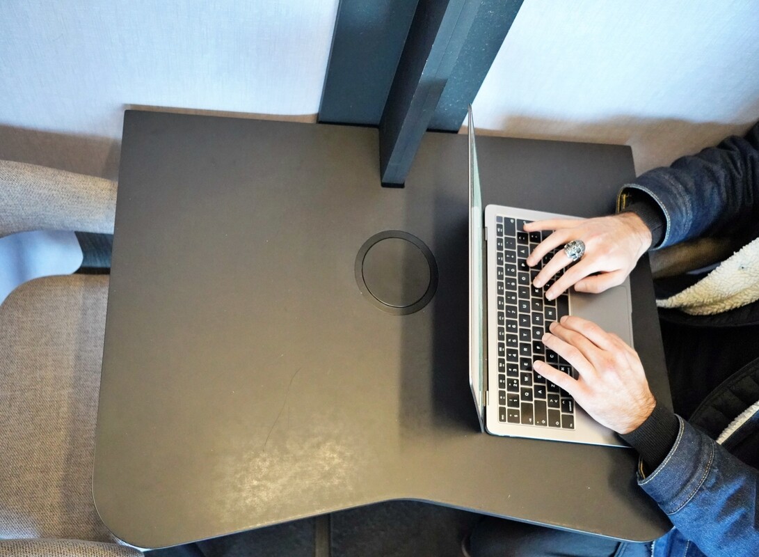 U središtu kabine nalazi se zajednički stol, koji omogućuje prirodan raspored za dvoje korisnika (stolice prikazane na fotografijama nisu uključene). Kabina je opremljena s dva velika prozora – jednim na vratima i jednim na bočnoj strani – što prostoru daje dodatnu svjetlost i osjećaj otvorenosti.