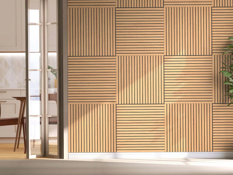 Akustični letvičasti panel (slat panel) od laminiranog PET materijala (HPL + VicPET) u kvadratnom formatu za zidove i stropove.