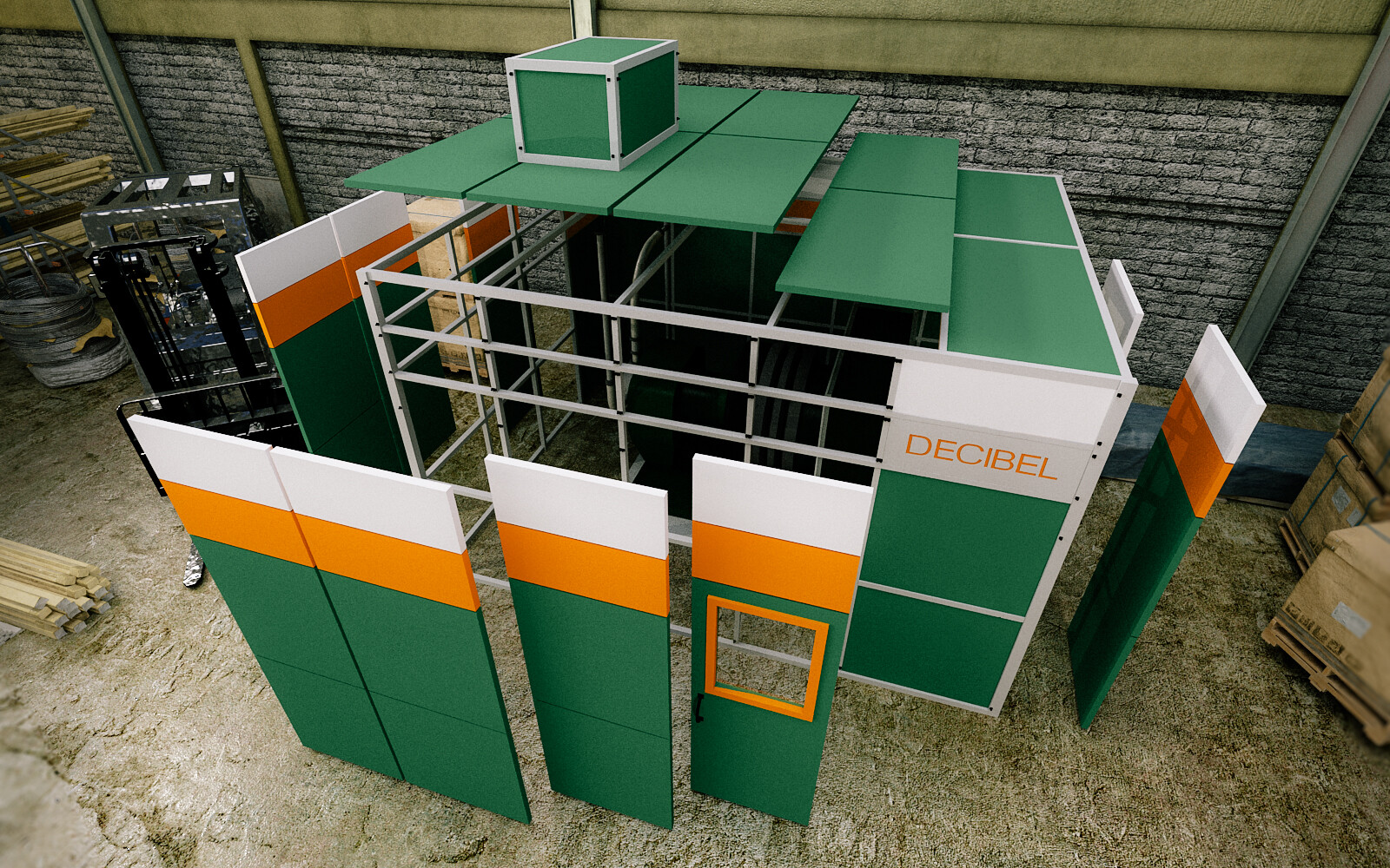 Kako bi smanjio buku od rada strojeva kao što su rashladni uređaji i generatori, DECIBEL je stvorio visokoučinkovitu kabinu koja se instalira oko strojeva i opreme, čime se eliminira buka koja dolazi iz njih.