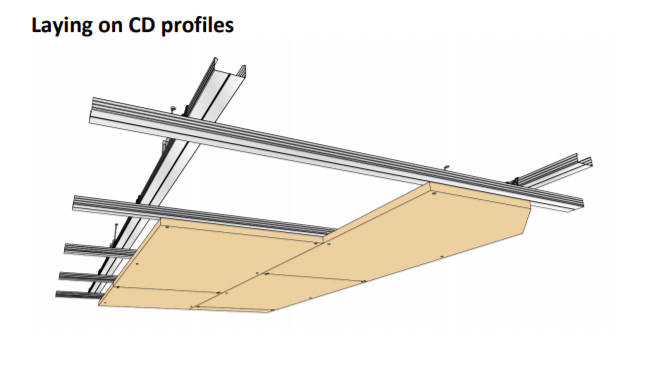 Fibro-Kustik paneli mogu se ugraditi direktno vijcima ili na metalnu ili drvenu konstrukciju, a mogu se ugraditi i na vidljive ili skrivene stropne profile.