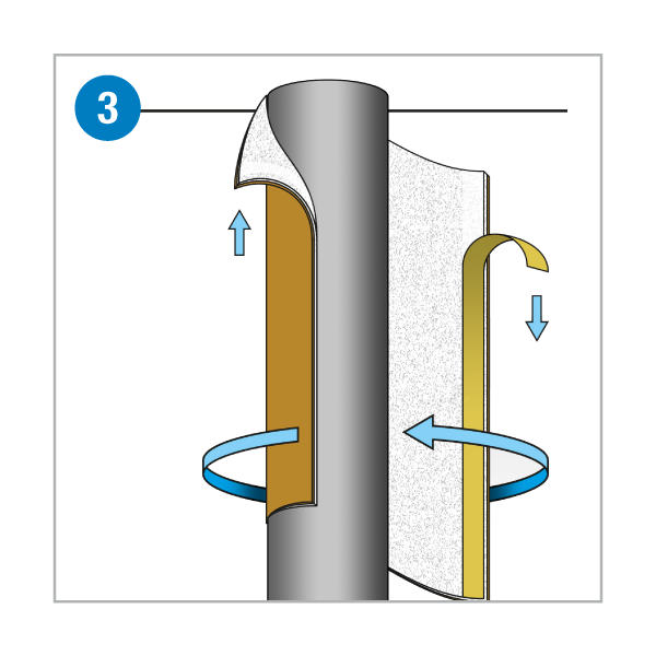 Omotajte proizvod oko cijevi tako da poliesterski flis dodiruje cijelu površinu i preklapa se u uzdužnom smjeru. Počnite od dna cijevi i krenite prema gore. Ne preklapajte poprečno i čvrsto spojite rubove. Učvrstite trake PVC vezicama svakih 30-40 cm.
