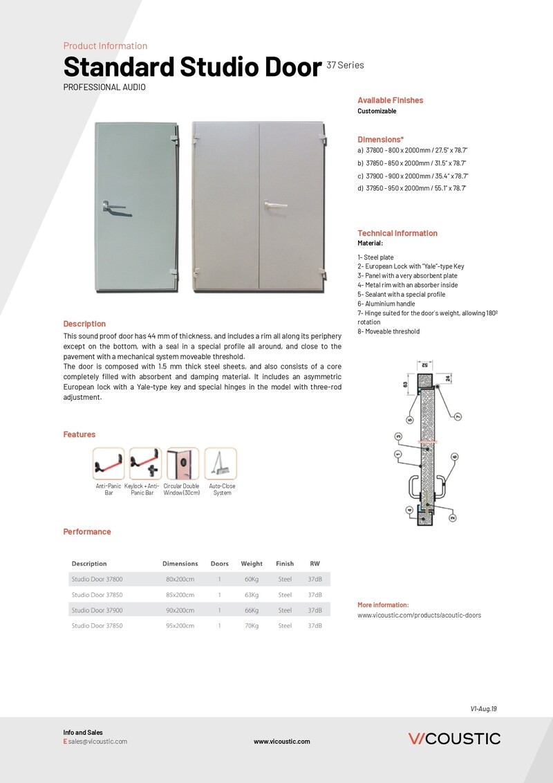 Vrata su sastavljena od čeličnih limova debljine 1,5 mm, a također se sastoje i od jezgre potpuno ispunjene upijajućim i prigušnim materijalom. Uključuju asimetričnu europsku bravu s ključem tipa Yale i posebne šarke u modelu s podešavanjem s tri šipke.